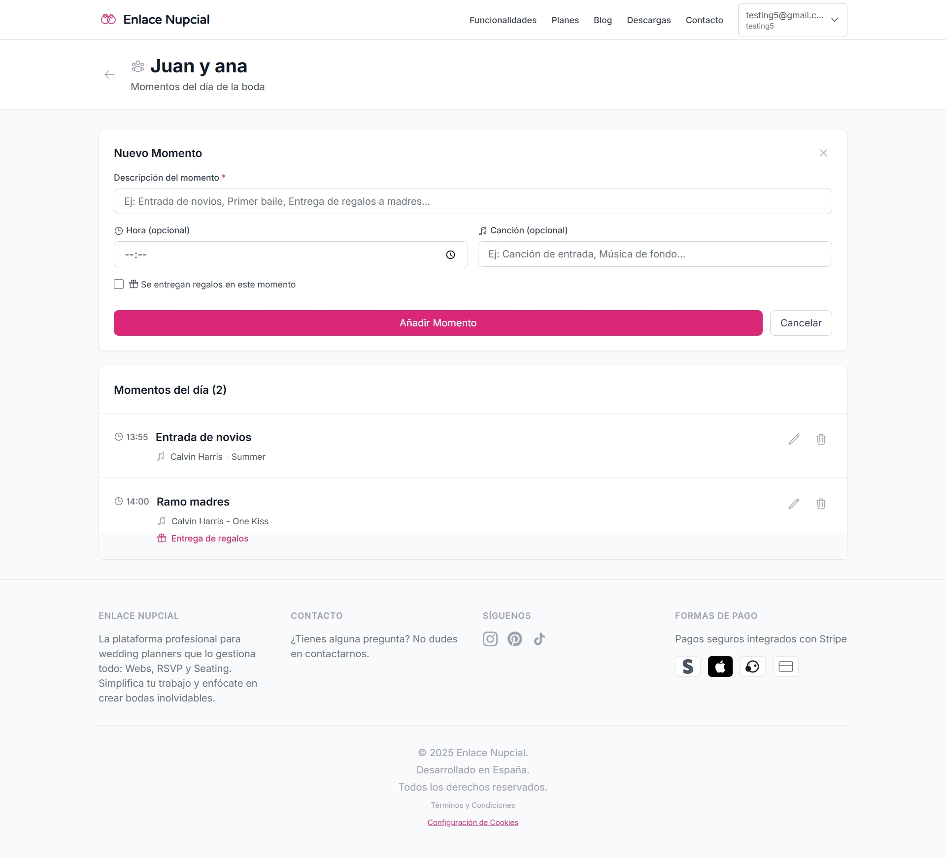 Únete a wedding planners profesionales que ya han transformado su negocio con nuestra plataforma completa.Páginas web de boda con diseños exclusivos, gestión de confirmaciones, organización de mesas, planificador de tareas, gestión de presupuestos y seguimiento completo del día B - todo en una sola herramienta.