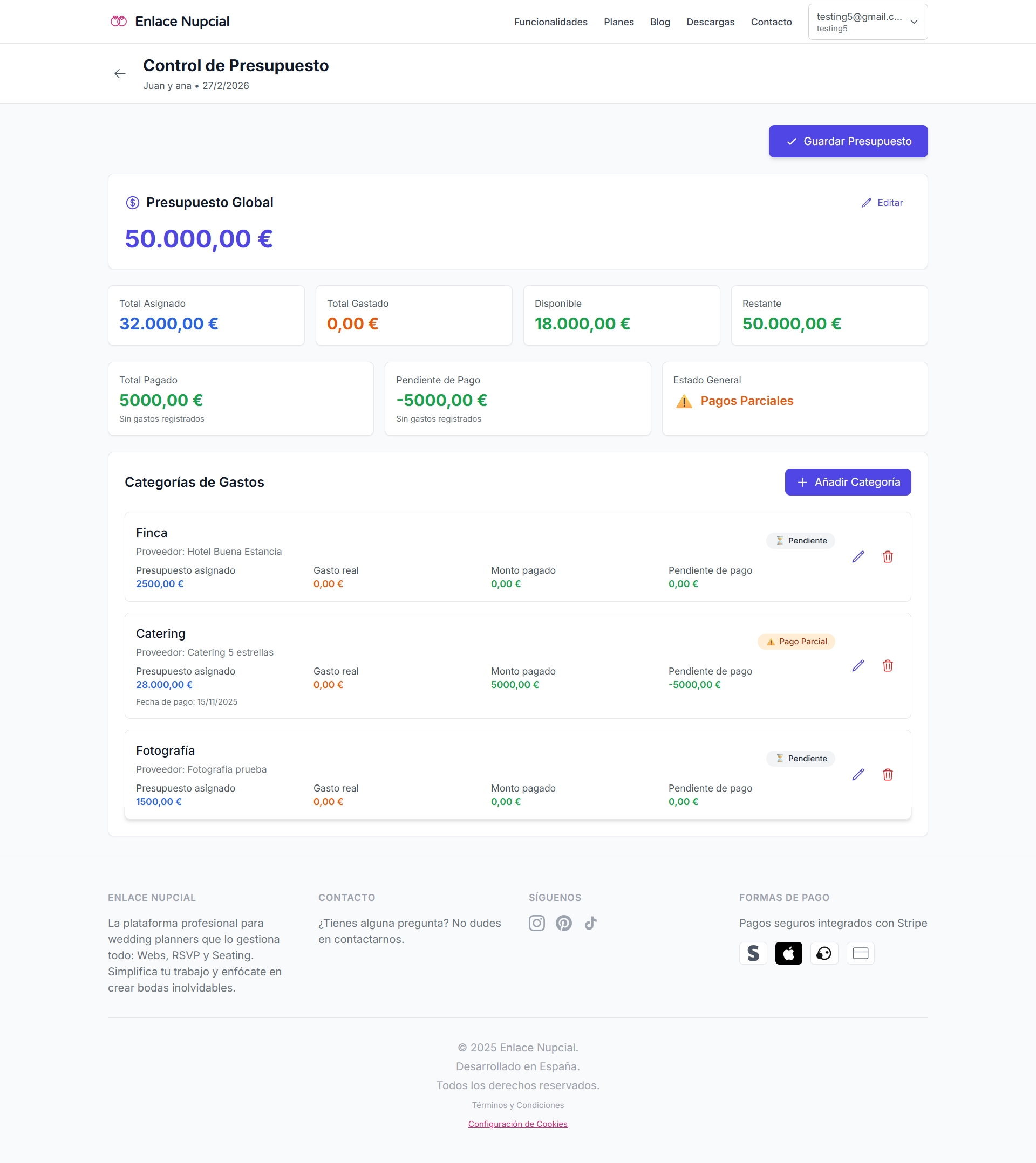 Gestiona el presupuesto completo de múltiples bodas simultáneamente. Organiza gastos por categorías, realiza seguimiento de pagos y mantén el control financiero total de cada proyecto sin mezclar información.