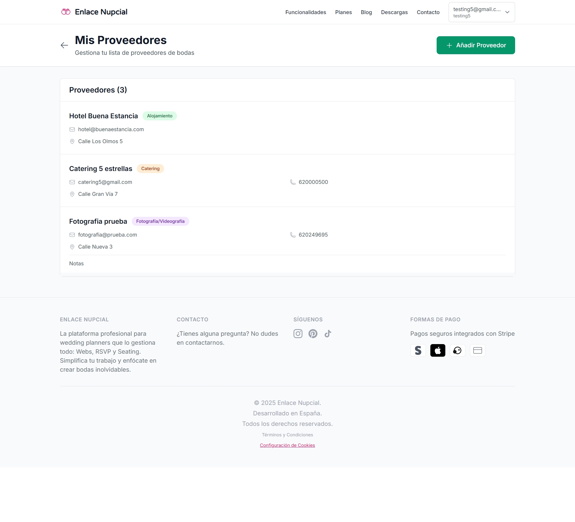 Crea y gestiona tu propia base de datos de proveedores. Organiza contactos por categorías y asócialos directamente a las categorías de tus presupuestos para tener un control completo de quién gestiona cada servicio en cada boda.